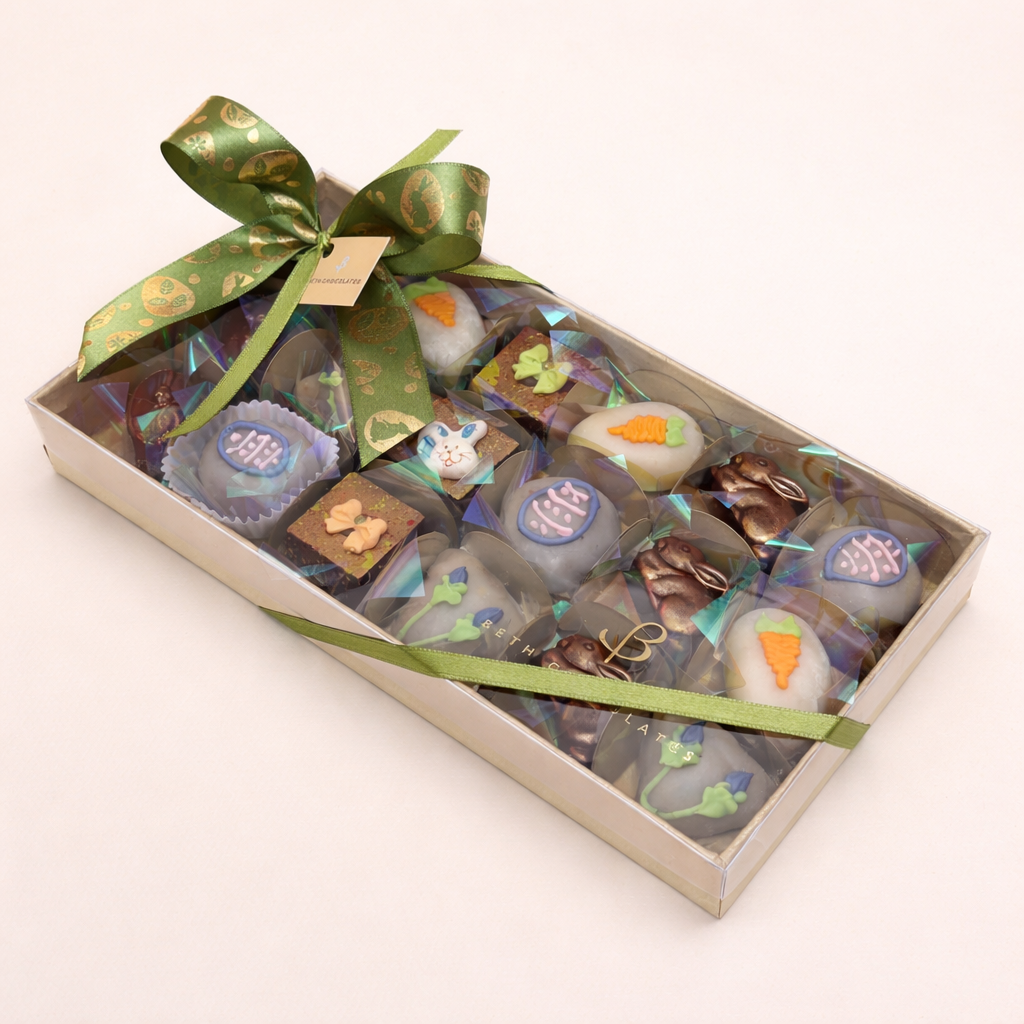 Caixa com 18 unidades de bombons e fondants sortidos. Um presente bem vintage com esse docinho tão antigo e amado.Os fondant são de amêndoas, noz pecan e pistache. Os bombons com tema de Páscoa.